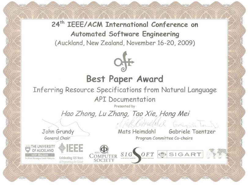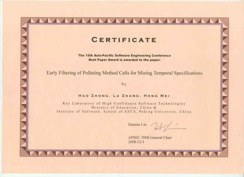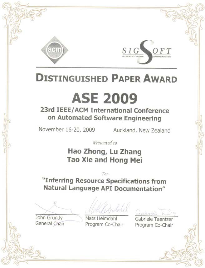 I received my Ph.D degree from Peking University in 2009. My Ph.D dissertation was nominated for the distinguished Ph.D dissertation award of China Computer Federation. My PhD advisor is Prof. Hong Mei, and was co-advised by Prof. Lu Zhang and Prof. Tao Xie. After graduation, I joined Institute of Software, Chinese Academy of Sciences as an assistant professor, and was promoted as an associated professor in 2011. From 2012 to 2014, I was a visiting scholar with University of California, Davis, where I worked with Prof. Zhendong Su. In 2014, I joined Shanghai Jiao Tong University. I am a recipient of ACM SIGSOFT Distinguished Paper Award, the best paper award of ASE, and the best paper award of APSEC.